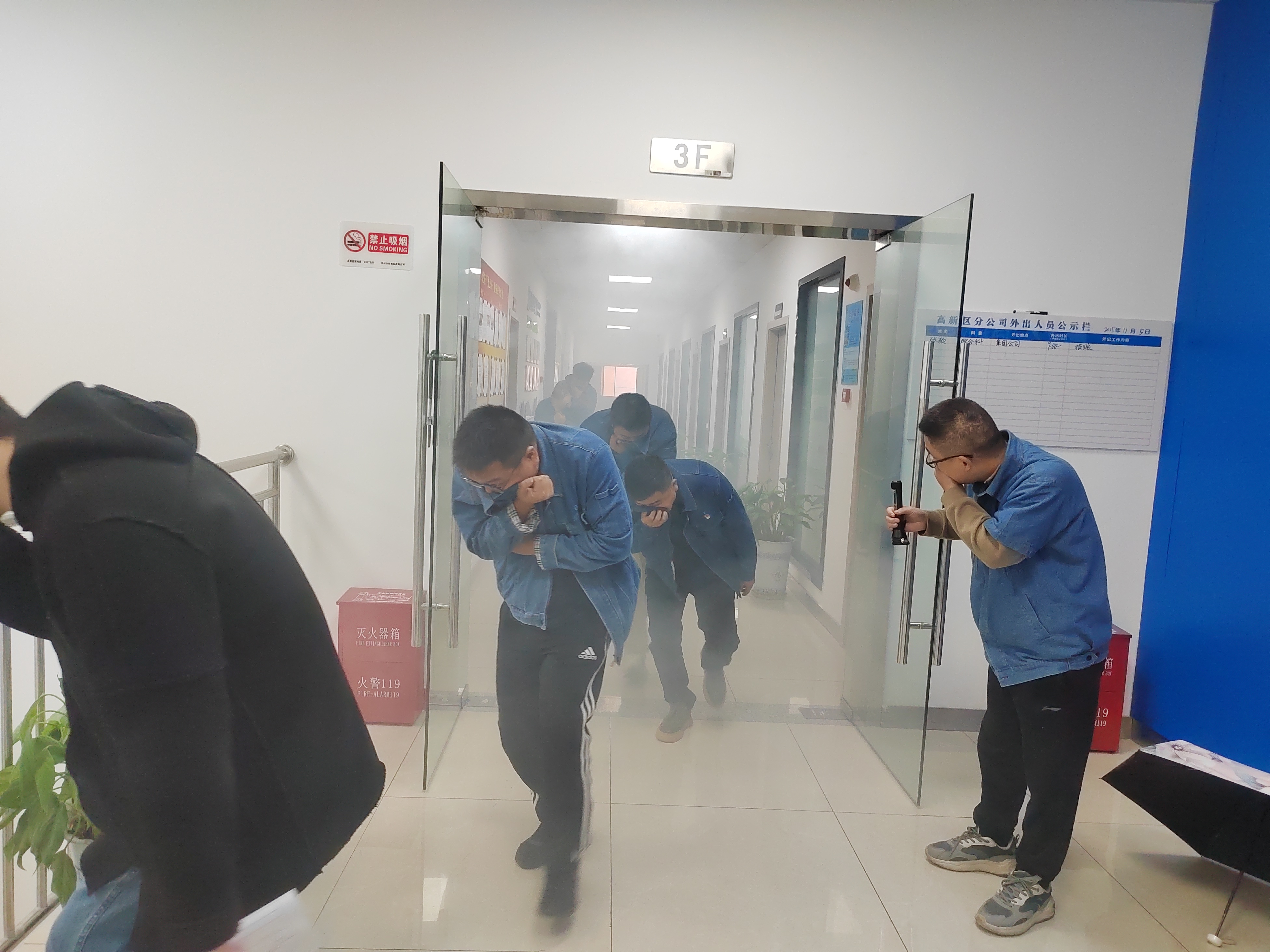 消防疏散演練模擬現(xiàn)場。警報聲響起,全體員工迅速行動,彎腰低頭、捂住口鼻,按預定路線有條不紊穿過“火災煙霧現(xiàn)場”。整個過程中,員工嚴格遵守要求,冷靜應對,展現(xiàn)良好應急反應能力。