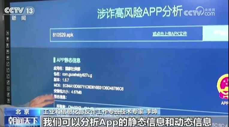工業(yè)和信息化部反詐工作專班技術(shù)專家 李坤:通過上傳App的安裝包,我們可以分析App的靜態(tài)信息和動態(tài)信息。靜態(tài)信息主要包含一些外在的特征,比如App的外在圖標,它涉詐圖標就是采用的國徽,它的名稱盜用了國家社保部(人社部)的名字,其他的是一些它的基本特征。實際上我們從外部的這些特征里可以看到,它會巧借國家公信力的名義去欺騙大眾,讓大眾誤以為這是國家主導(dǎo)或者國家支持的一些資助項目,進而引導(dǎo)用戶進行投資。通過對圖標、名稱以及內(nèi)在進行分析,我們可以認定這就是一個涉詐的App。