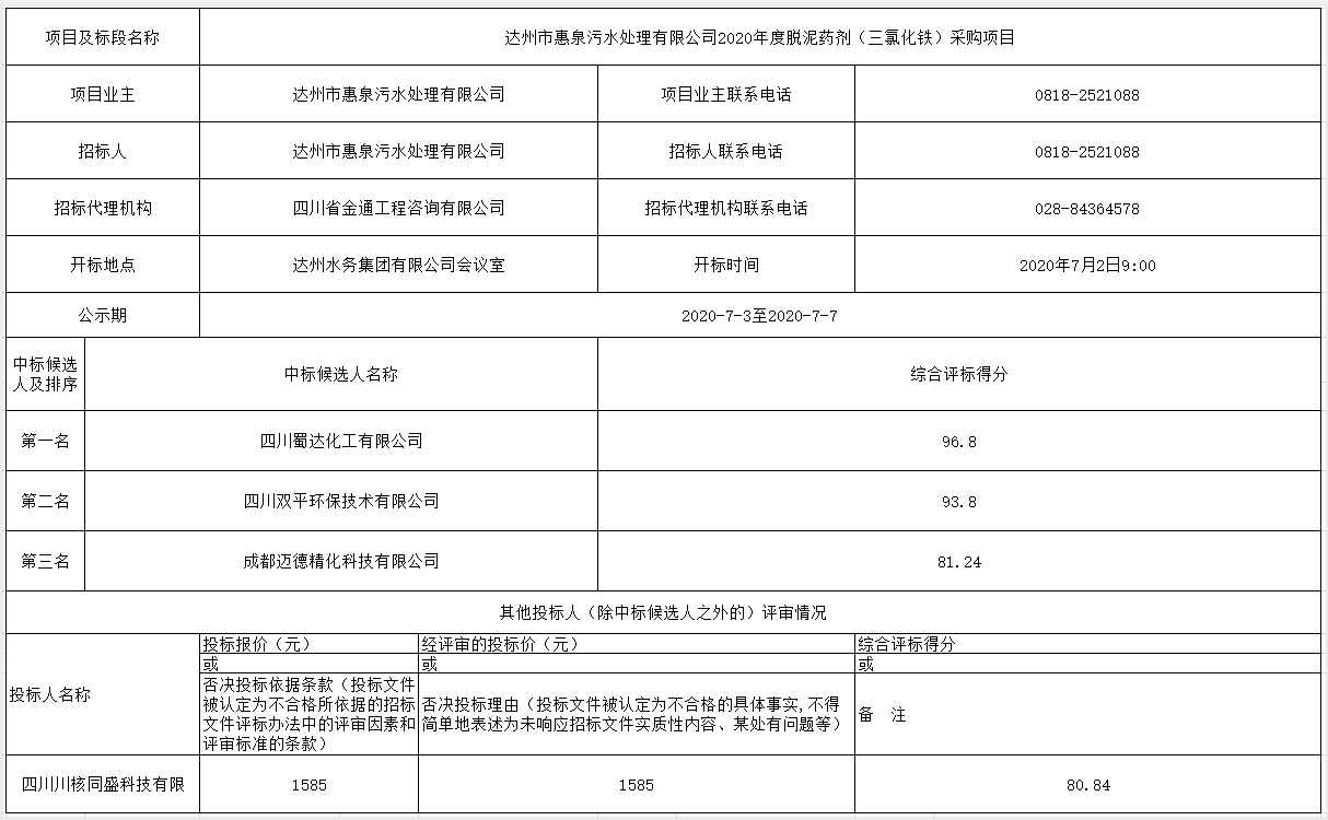 上一篇:達州市惠泉污水處理有限公司2020年度單過硫酸氫鉀復(fù)合粉采購項目中標(biāo)候選人公示
