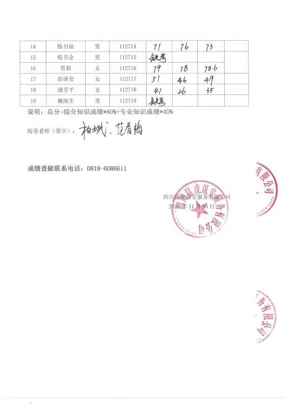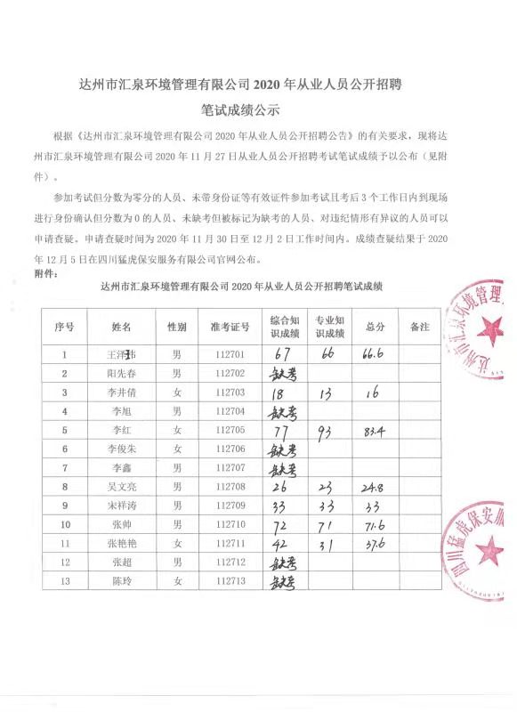 標(biāo)題:達(dá)州市匯泉環(huán)境管理有限公司2020年從業(yè)人員公開(kāi)招聘參加筆試成績(jī)公示